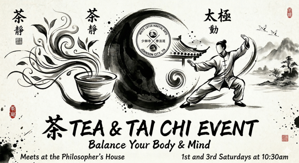 Join the White Lotus crew on the 1st and 3rd Saturdays each month for the best Tea in Johnson City, some heartfelt community, and some relaxing yet invigorating movement arts to top it all off. We will meet at the Philosopher’s House for a tea of your choice, then head out to the park (weather permitting) for Yang 24 (Beijing Style) Tai Chi. Our warmup will include some Qigong and exercises influenced by martial arts style like Bajiquan and Baguazhang.